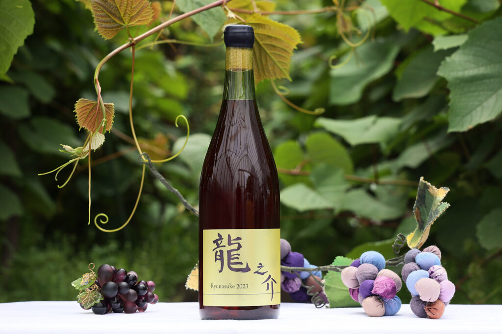 通常はマセラシオン・カルボニックの工程で果皮が自然と破れて果汁が染み出てくるものだが、「龍之介」に使用している「山幸」は果皮が厚いために破れることなく、果皮の中で発酵が起こる。40日間も粒のまま発酵するので、絞ると中は発酵している状態だ。絞った後も淡い色合いだったため、2023年まではロゼワインとしてリリースしていた。