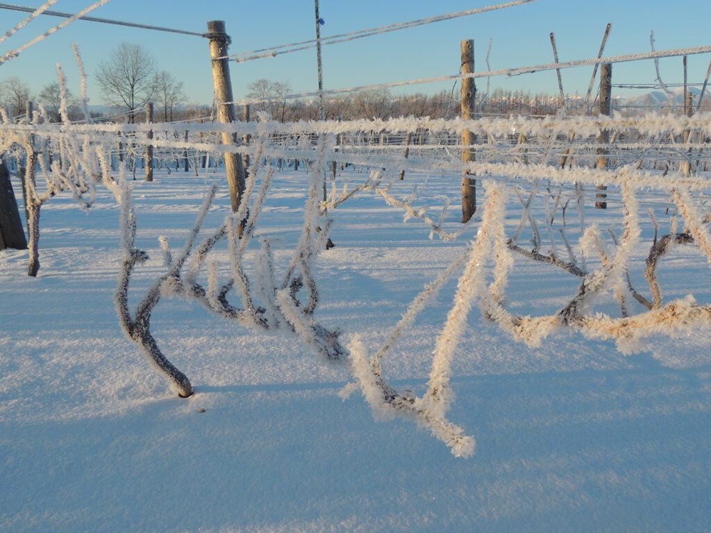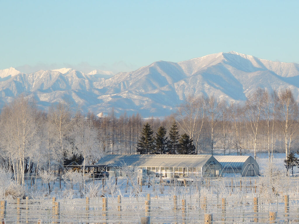 相澤ワイナリーがある十勝平野は、「北海道の背骨」と呼ばれる日高山脈によって雲が遮られるため、北海道の中では降雪量が少ないエリアだ。12月から3月にかけての積雪量は、平均30~60cm程度。冬場の気温はマイナス30℃まで下がるため、耐寒性のある品種でなければ育たない。