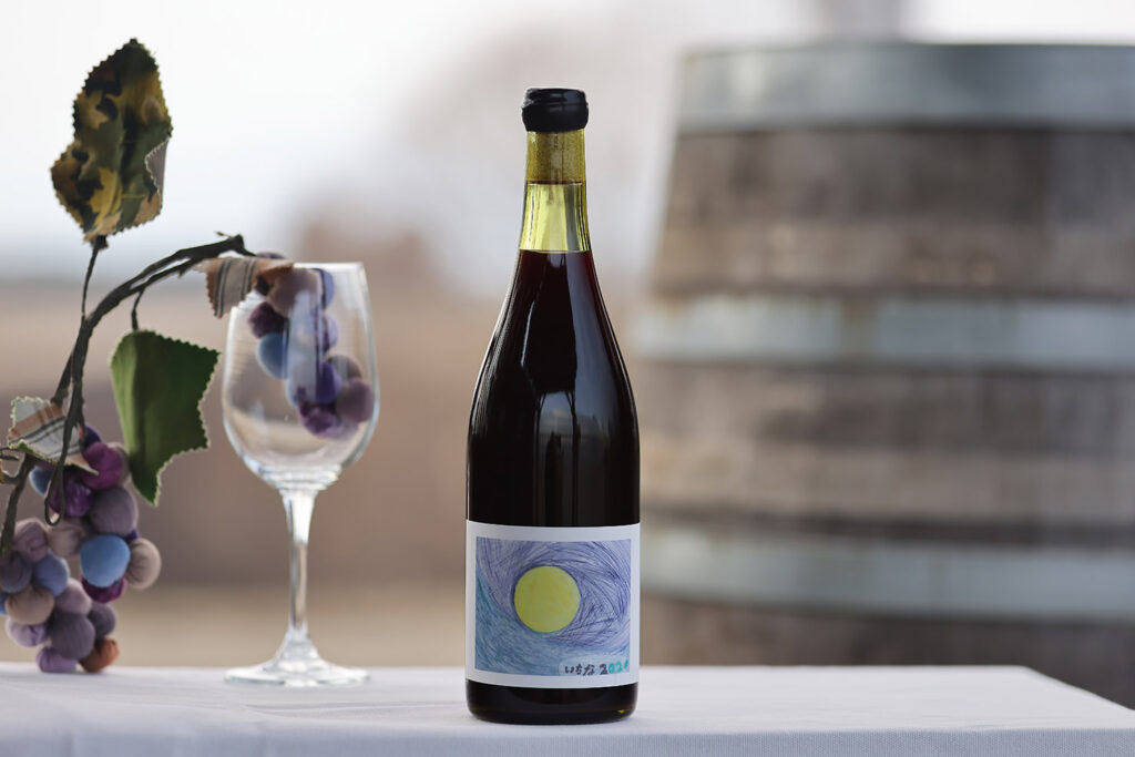 最初に紹介するのは、オリジナル品種を使った「いちな 2024」。手作業で丁寧に除梗したぶどうを「水瓶(みずがめ)」に入れて野生酵母で発酵させ、絞ってからステンレスタンクに移して4か月間熟成。無濾過・無清澄で瓶詰めした。