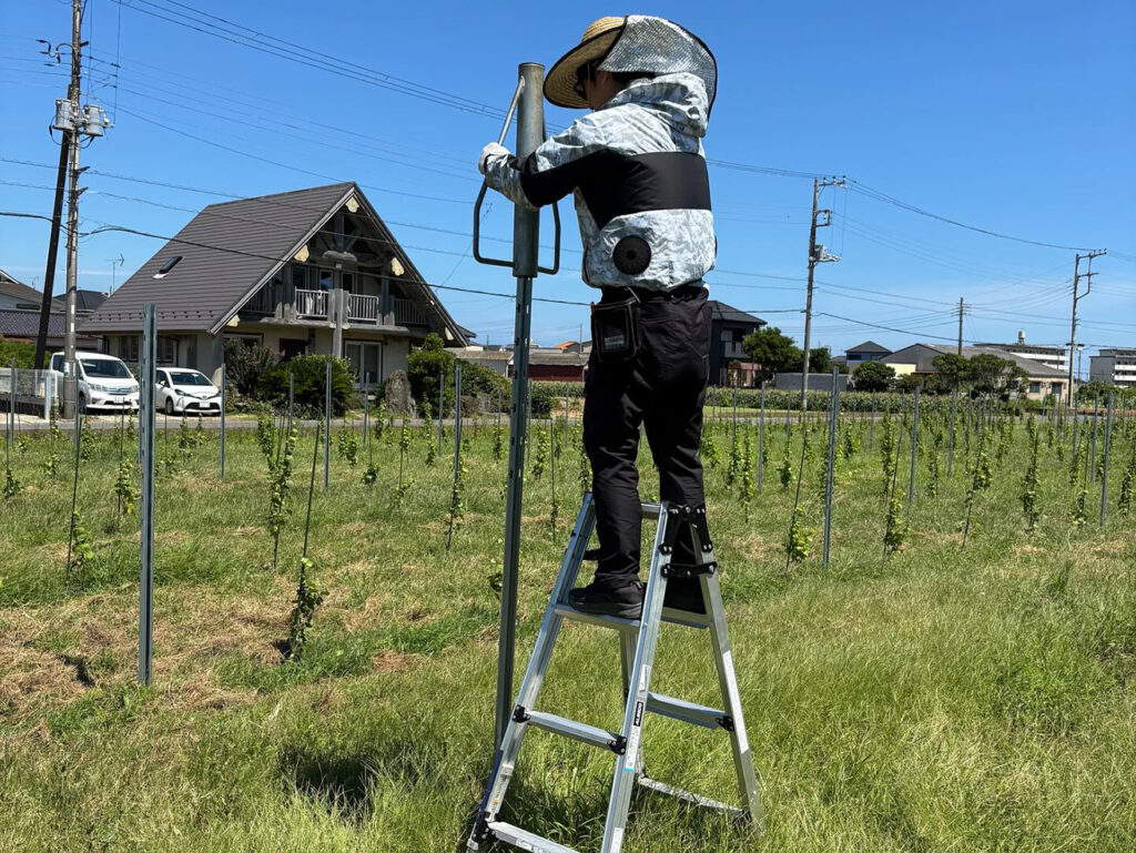 銚子市は、千葉県のなかでは降雨量が少ない地域だ。しかし、海沿いということもあって風が恒常的に強いのが特徴である。風の影響を抑えるため、栽培方式には垣根仕立てを採用した。