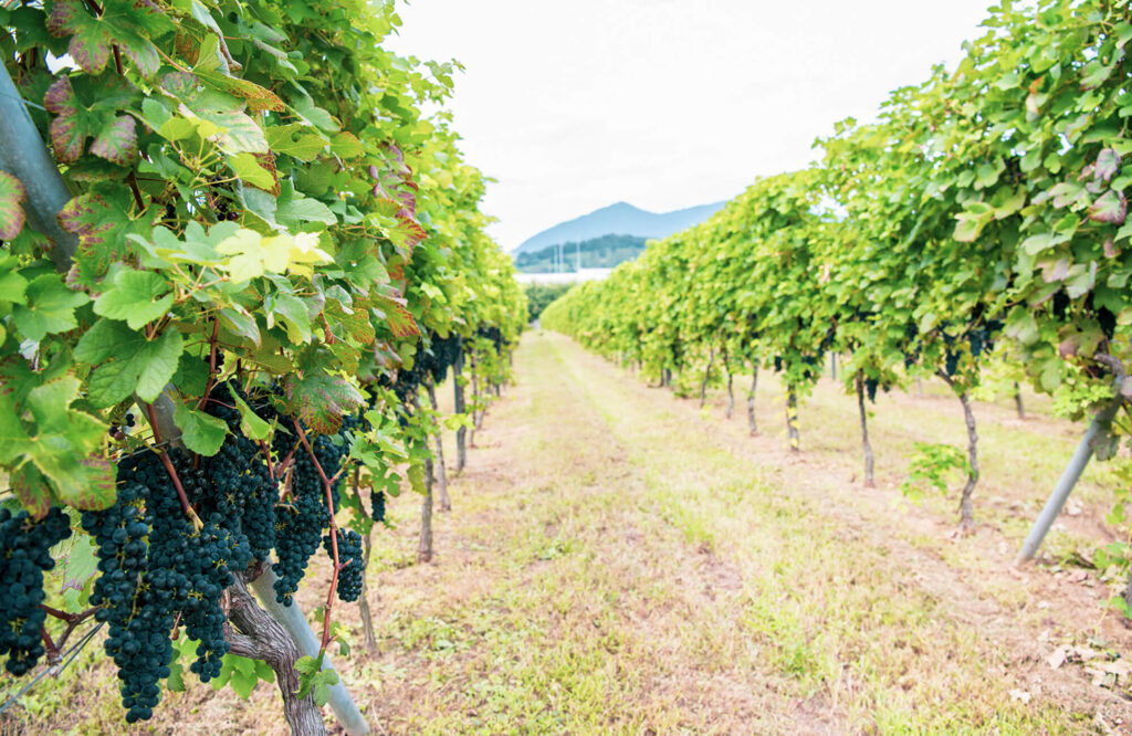 「『摘芯』作業の違いが一番大きいでしょうか。ヤマブドウ系のぶどうはツル性が強いため、自立せずに垂れ下がってくる傾向があります。そのため、垂れ下がった部分をきっちりと摘芯しないと風通しが阻害されるので蒸れやすくなってしまいます。しかし、ヨーロッパ系品種は最初の誘引をしっかりとおこなっていれば、その後は手を加えなくても自立してくれるため、ヤマブドウ品種に比べて栽培管理が容易なのです」。