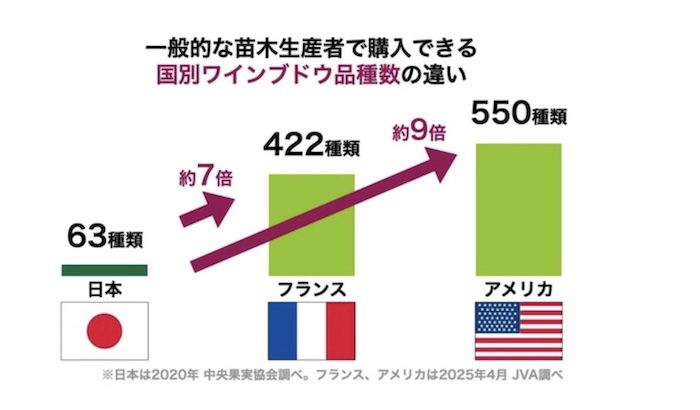 品種については、今でこそ日本でもさまざまな品種が育てられるようになってきましたが、海外に比べると入手可能な品種数の少なさは歴然としています。また温暖化の影響で、高温や多湿による病害の増加、糖度や酸のバランスの変化が起こり、今までうまく育っていた品種が育たなくなるという状況が日本各地で見受けられます。