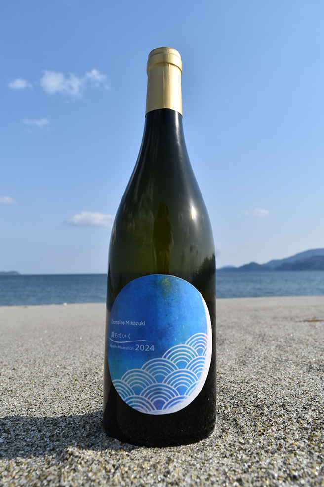 ワインのエチケットは、丸くくり抜かれたデザインが特徴だ。ワイナリー名の由来でもある「月」と、「青海波(せいがいは)」という海をイメージさせ平和を象徴する伝統的な和紋をモチーフにしている。ネーミングは「満ちていく」。三日月が満月に向かうようにという「発展」の願いと、気分が満ちていくことへの意味を込めた。
