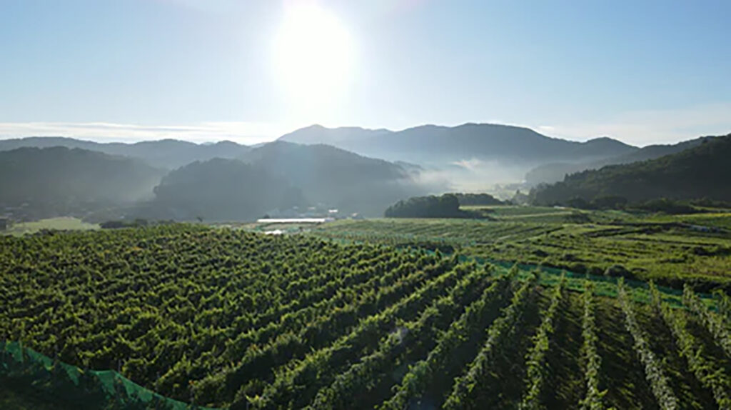 福井県越前市にある『SIX THREE ESTATE WINERY(シックス スリー エステート ワイナリー)』。ぶどう畑の周囲を緑の山々が囲み、上空にはコウノトリが舞う土地だ。