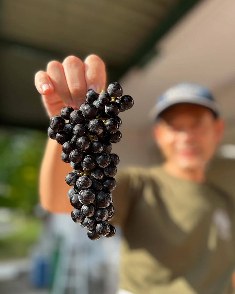 「小公子は、ヤマブドウ由来による強い酸味が特徴ですね。色付きと糖度が十分に上がった状態で収穫しています。小公子は病気に強いので、健全に育って完熟させることができます。アジアの薬草を思わせるような香りとスパイス感がありますよ」。