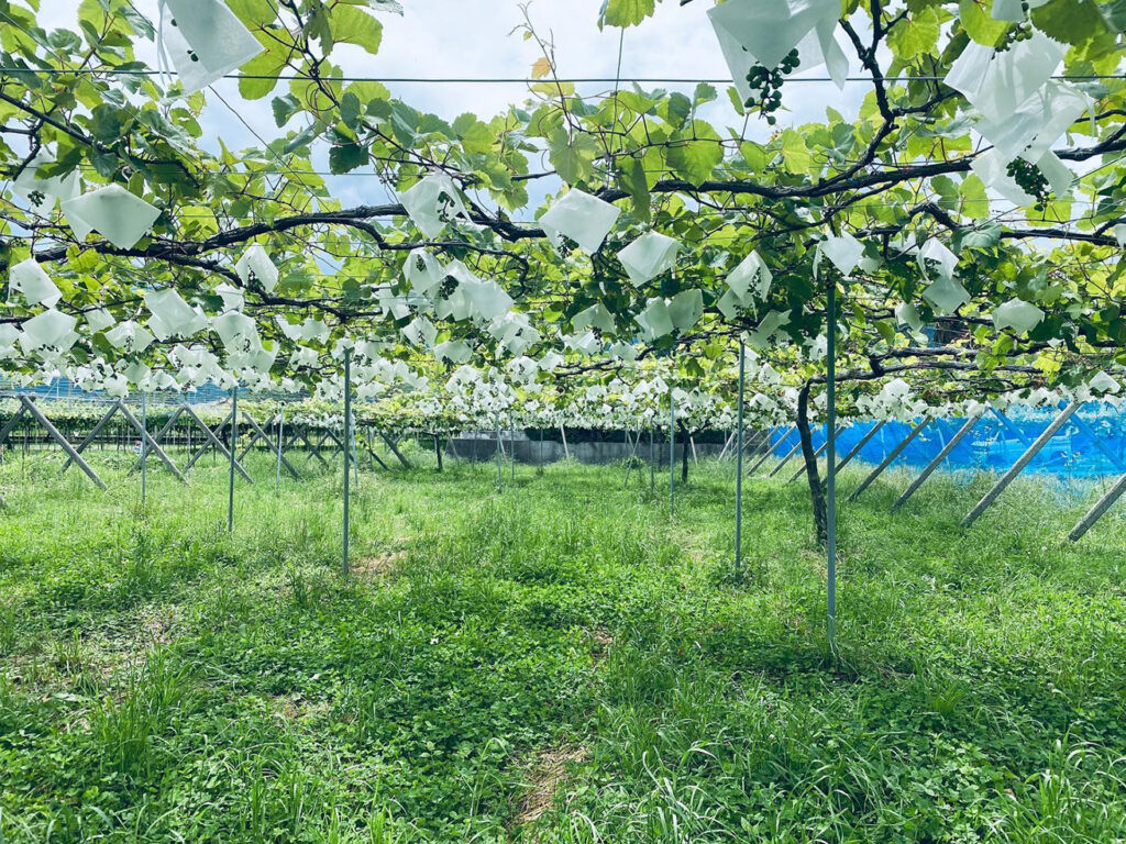 ドメーヌヒデは化学農薬不使用のぶどう栽培が特徴だが、「絶景ぶどう畑」は畑の近くに他の畑がないため、農薬の流入を気にする必要がない点で非常に恵まれている。