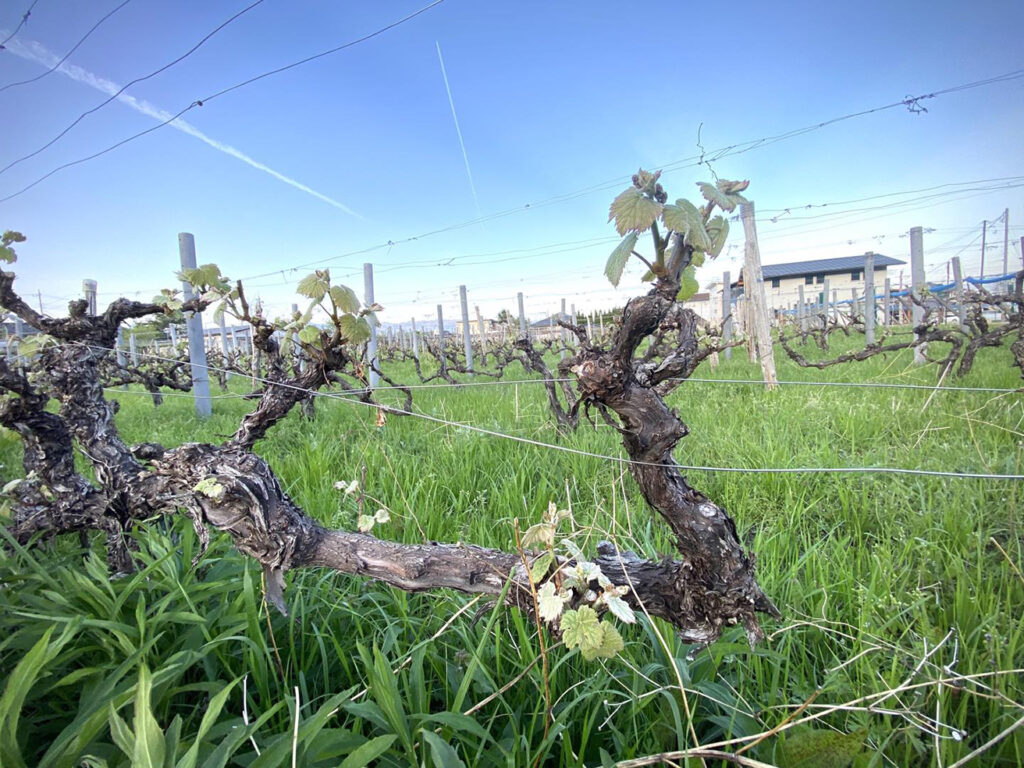 引き継いだ畑のヤマソーヴィニヨンは、日本では稀な「ゴブレ仕立て」。名前の由来はフランス語で「コップ」を意味する「ゴブレ(Goblet)」で、メインの幹を低く育てるのが特徴だ。南フランス、スペイン、ポルトガルなど、乾燥した産地で用いられることが多い仕立て方である。