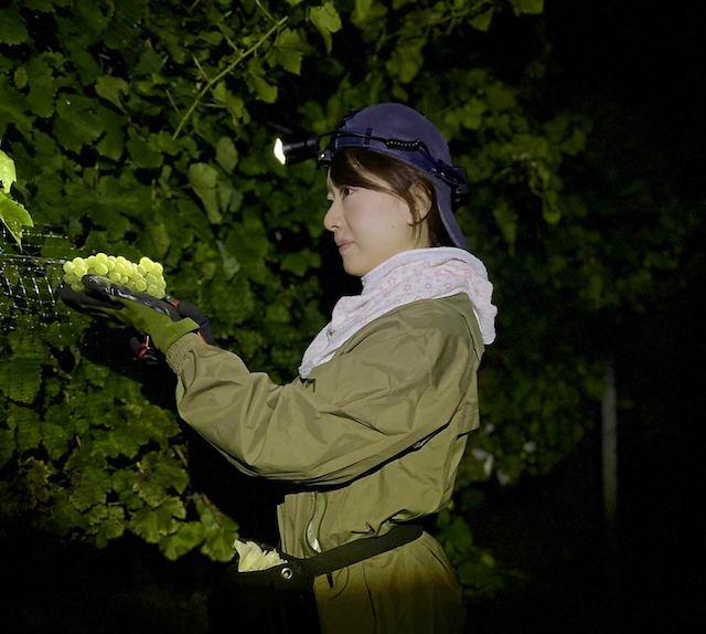 「ワインに使うソーヴィニヨン・ブランは、収穫作業を手伝わせていただけることになり、香りを引き出すために夜間に収穫するナイト・ハーべストに参加しました。出来上がったワインのテイスティングも一緒におこない、もう少し厚みがほしいなどの意見を出し合って、シャルドネをブレンドしました」。